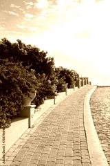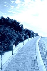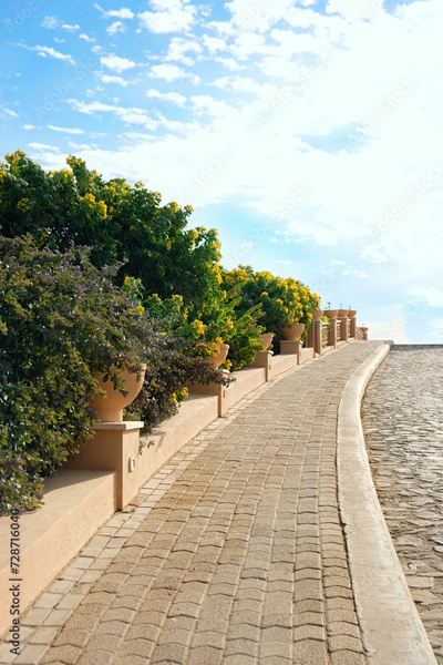 Beautiful landscape with stone road and Tropical plants with flowers. atmosphere exotic natural background. template for design