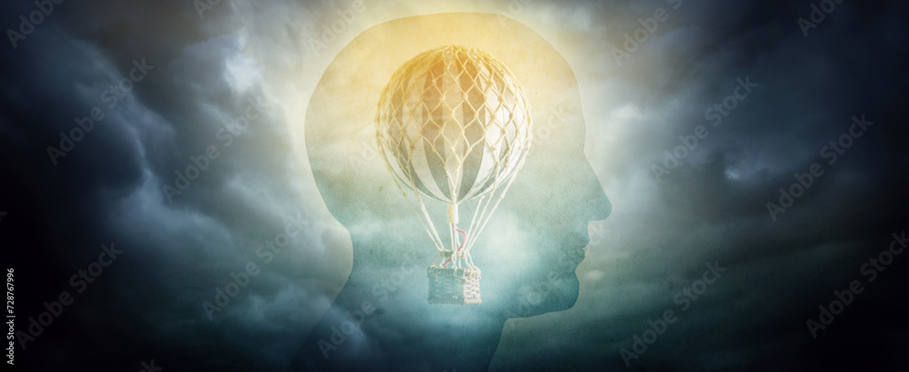 Silhouette of a man with a balloon, aerostat (symbol of freedom of thought). Concept on the theme of psychiatry, psychology, religion, science.