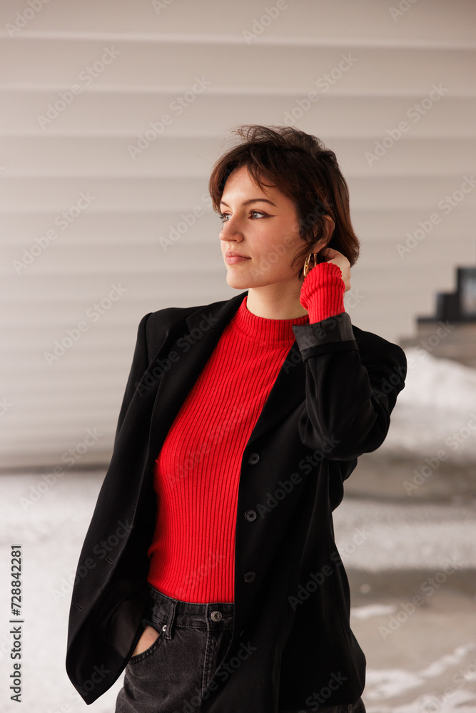 Confident young professional woman working in a modern office. A businesswoman poses for the camera for business portraits in a red sweater and black jacket. A young marketer inspired to work
