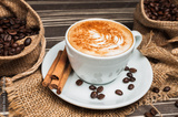 Cappuccino in a white cup with cinnamon and drawing on milk