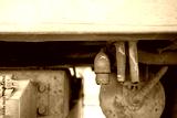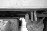 Drainage water pipeline on the train or locomotive cabin that releasing dirty water into the railway. Machinery part object photo, close-up.