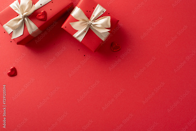 Upscale gift tableau for women: top view voguish boxes, heart symbols, and glitter set against a red backdrop, with provision for your text or marketing