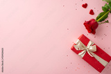 Ultimate surprise for a woman: top view of luxe rose, fashionable gift parcel, heart shapes, and sparkles on a delicate pink surface, with space for text