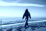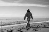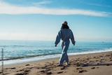 Young woman tourist in blue sport suit walks along the seashore, enjoys the seascape. Travel, tourism concept. Active lifestyle.
