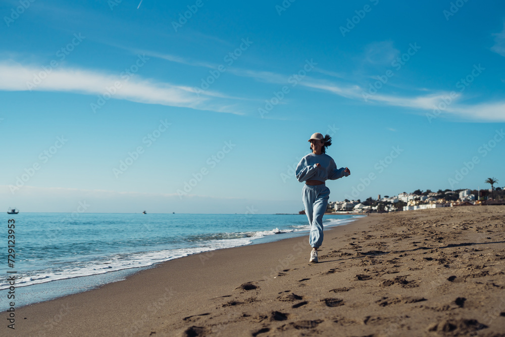 a girl in a sportsuit runs along the seashore. Expressive emotions pleased a woman running along the beach and feeling freedom. Emotions of happiness and pleasure. Happy girl running on the beach