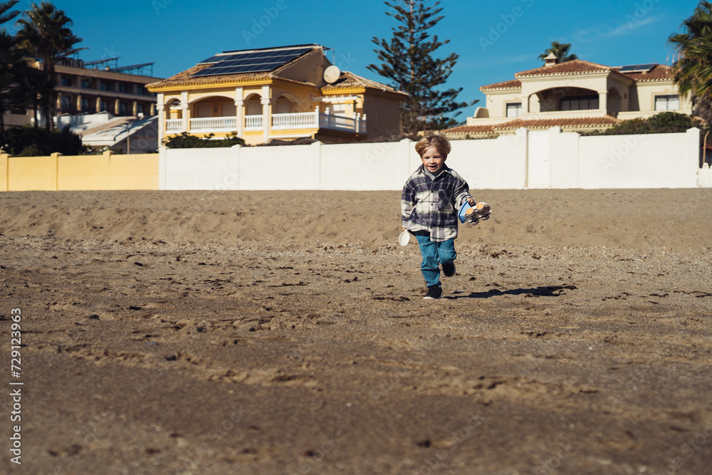 The boy jumps up on the sandy beach near the sea. a 3-year-old boy in a checkered shirt plays on the sand. cheerful active baby jumping on the sand