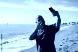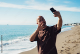 Image of a handsome man taking a selfie photo on a smartphone while walking by the sea.