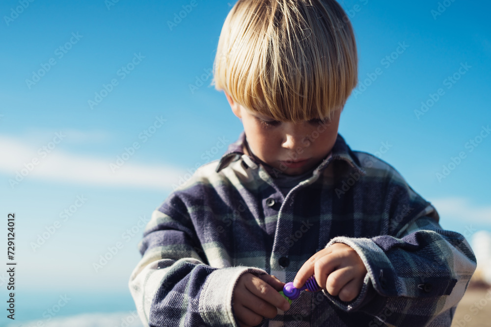 blond boy 3 years old plays with a toy on the seashore. boy holding a toy in his hands. child's fantasies. baby plays with a toy.