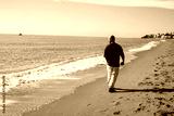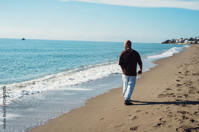 A mature adult man, wearing a T-shirt and jeans, happily walks along the seashore. A smiling man walks along the beach on a sunny day. A bald man with a beard walks along the seashore.