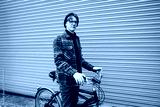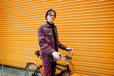 Young stylish hipster man standing with a cruiser city Bicycle near orange Wall. Student Resting after ride bicycle. Eco friendly transportation for carbon footprint. Sustainable lifestyle.