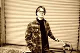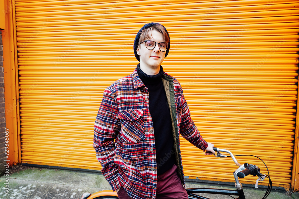Young stylish hipster man standing with a cruiser city Bicycle near orange Wall. Student Resting after ride bicycle. Eco friendly transportation for carbon footprint. Sustainable lifestyle