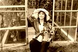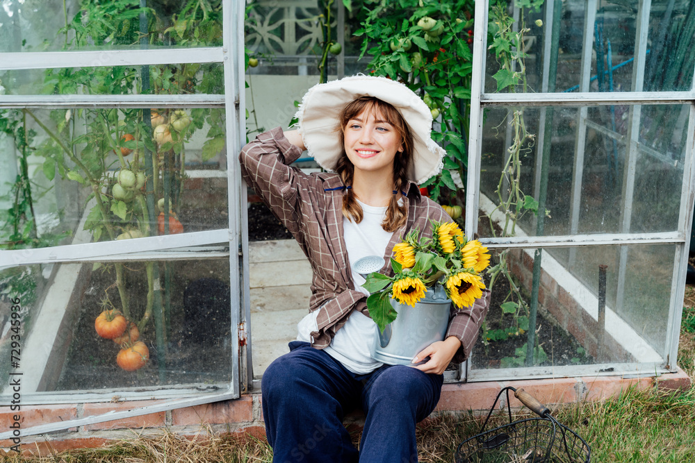 Portrait of smiling young female farmer woman holding watering can with fresh sunflowers bouquet, sits near greenhouse with ripe tomatoes. Urban farming lifestyle. Growing organic vegetables in garden