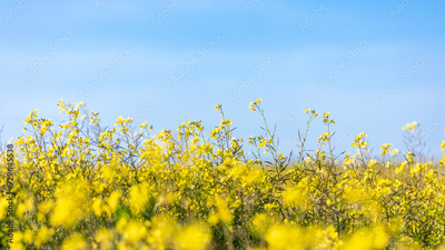 Spring background on blue sky and selective focus on flowers and blur background for copy.