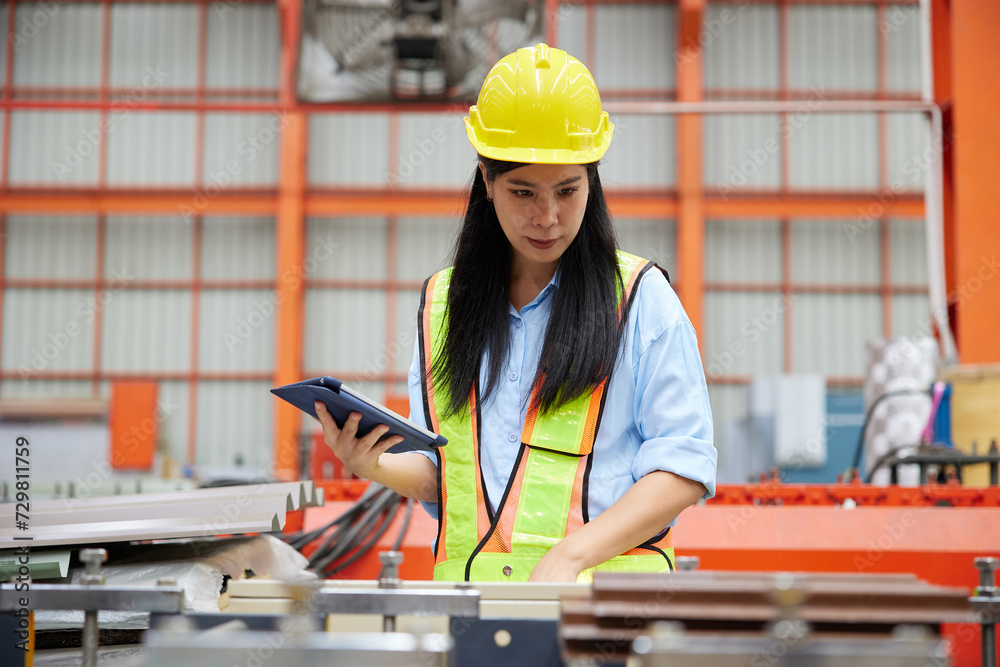 worker or technician working on tablet and checking machine in the factory