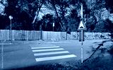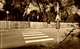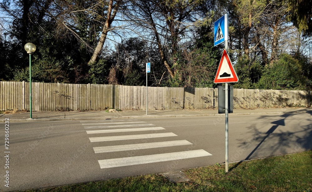 Speed bump sign and pedestrian crossing sign in front of a crosswalk .Wooden slat fence,sidewalk, and green area on the other side of the road . Background for copy space.