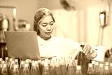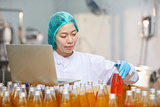 female worker working on laptop computer for checking basil seed drinks in the beverage factory