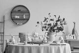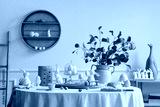 Warm and spring dining room interior with easter accessories, round table, vase with green leaves, cake, colorful eggs, rabbit sculpture and personal accessories. Home decor. Template.