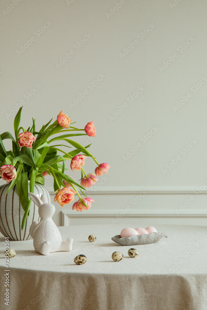 Minimalist composition of easter dining room interior with copy space, vase with tulips, colorful eggs, gray hen sculpture, beige wall with stucco and personal accessories. Home decor. Template.