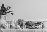 Creative composition of easter living room interior with bread, basket, carrot, vase with spring tulips, easter bunny sculpture, colorful easter eggs and personal accessories. Home decor. Template.