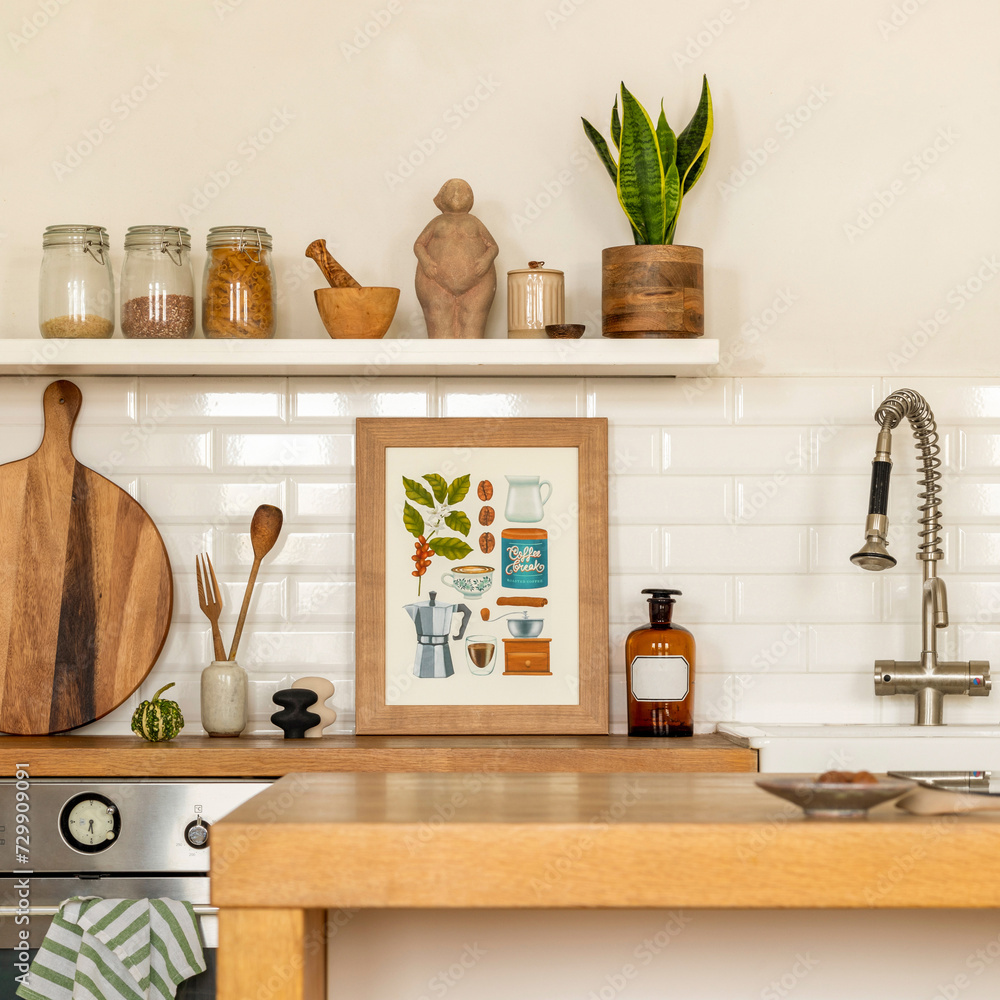 Interior design of dining room interior with mock up poster frame, wooden kitchen island, silver tap, plant, white tiles on wall, round cutting board and kitchen accessories. Home decor. Template.