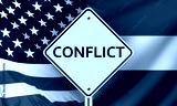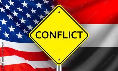 Conflict USA and Yemen. Flags of opposing states. Military crisis between America and houthis. National symbols of Yemen and USA. Conflict inscription on yellow road sign. 3d image.