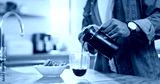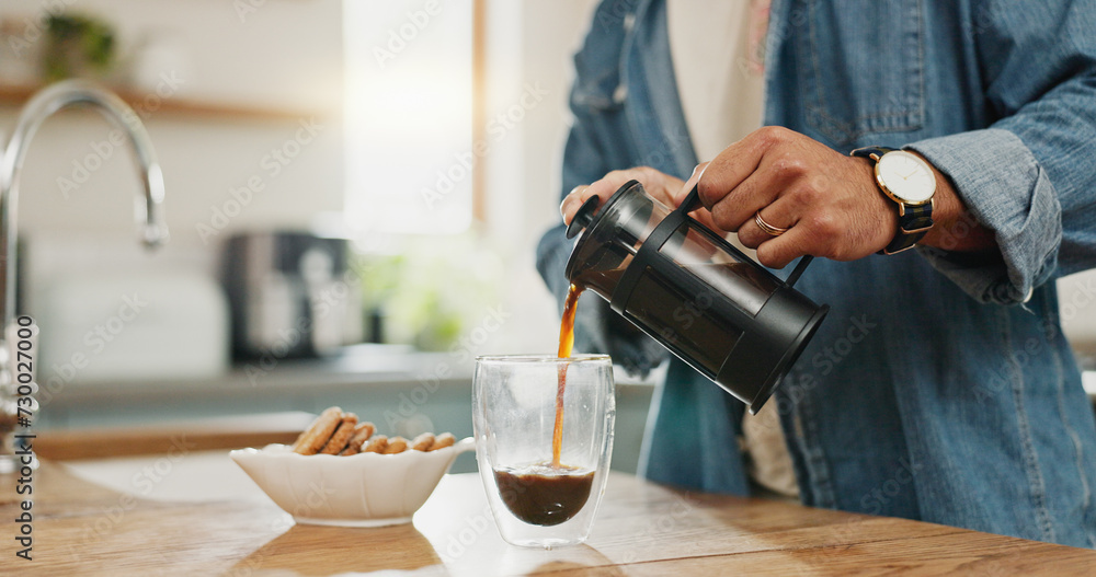 Hands, pouring coffee and breakfast in home kitchen, energy and start morning with warm matcha at table. Man, filter kettle and french press plunger for fresh organic caffeine at house for hot drink