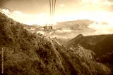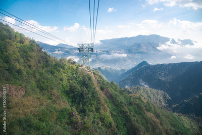 Foggy and sunny scenic view Hoang Lien Son mountain range, Muong Hoa Valley, aerial lift pylon cable car pillar steel framework hauled gondola lift ropeway above ground, cloud blue sky, Sapa