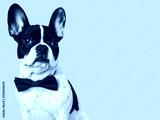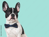 Cute puppy and bright bow tie. Close-up, indoors. Concept of beauty and fashion. Studio shot, isolated background. Congratulations for family, loved ones, relatives, friends and colleagues. Pets care
