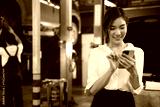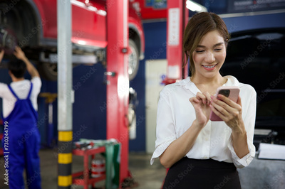 businesswoman or customer chatting and messaging on smartphone in automobile repair shop