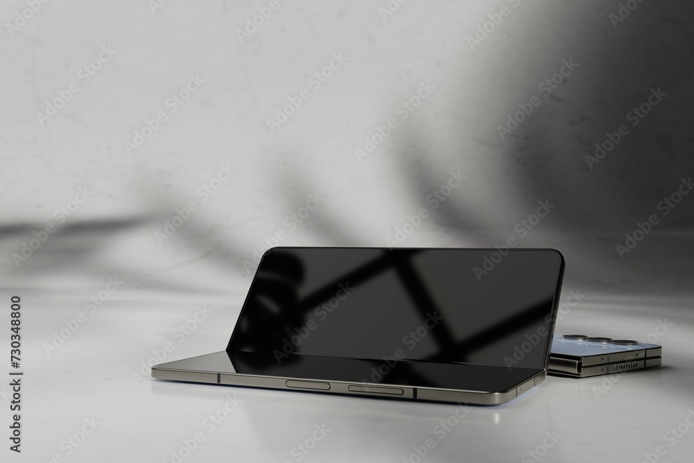 Foldable smartphone mockup with shadows overlay and screen reflection