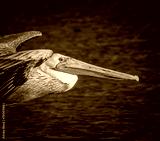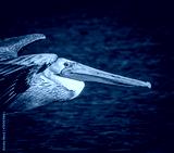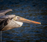 An extreme close up of the eye and beak of the American brown pelican in flight