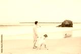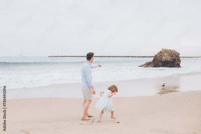 Dad and daughter little girl walking on the beach in the sand