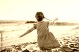 girl with braids in a blue denim dress twirling in the sand at the beach with her back to the camera