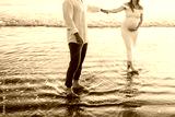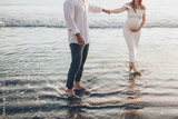 close up crop photo of a pregnant maternity couple holding hands looking at each other standing in the water at sunset on the beach