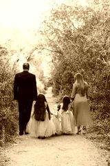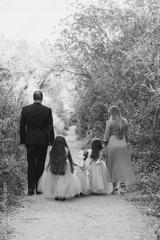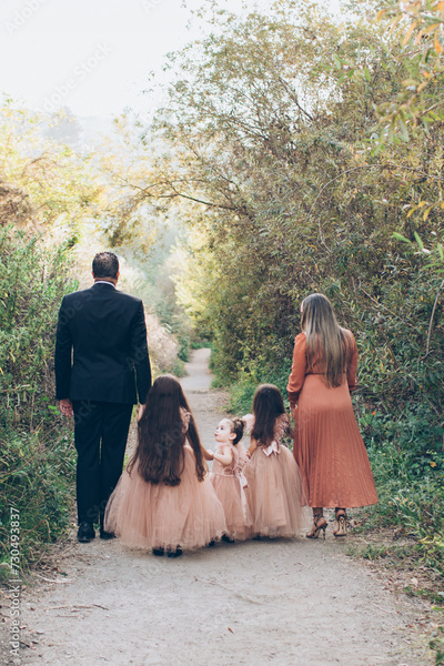 mother and father, mom and dad, wearing fancy nice clothes holding hands with their daughters, family, wearing tulle dresses walking away from the camera down a wooded path