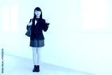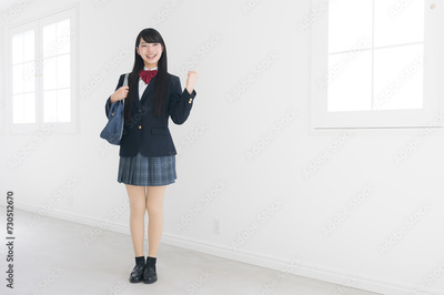 使いやすい白背景で笑顔でガッツポーズの女子高生 全身