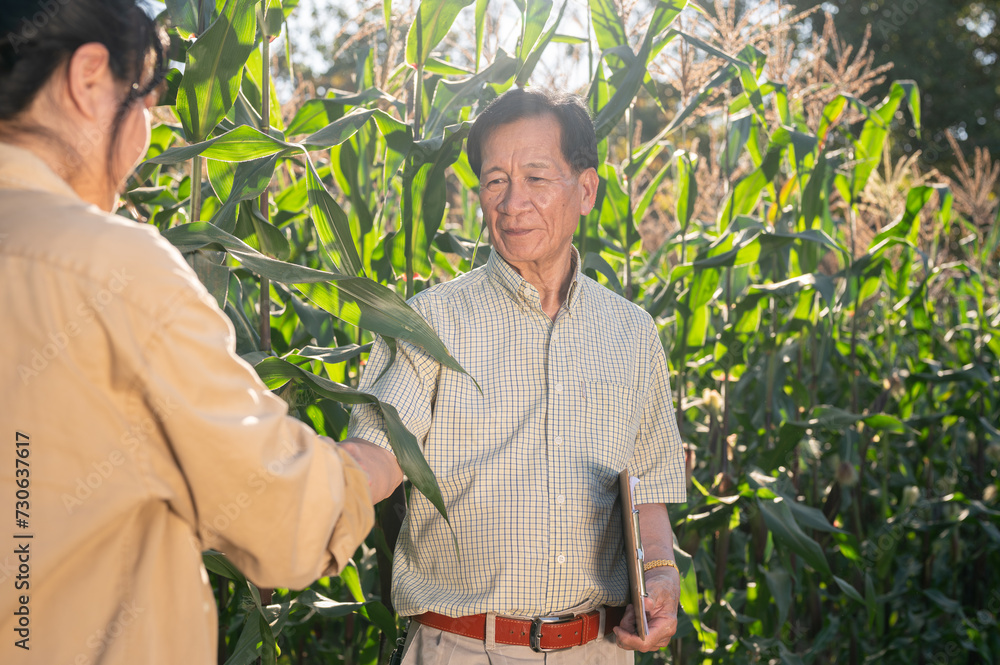 An experienced senior Asian male farmer is shaking hand with a female supplier in his corn field.
