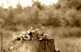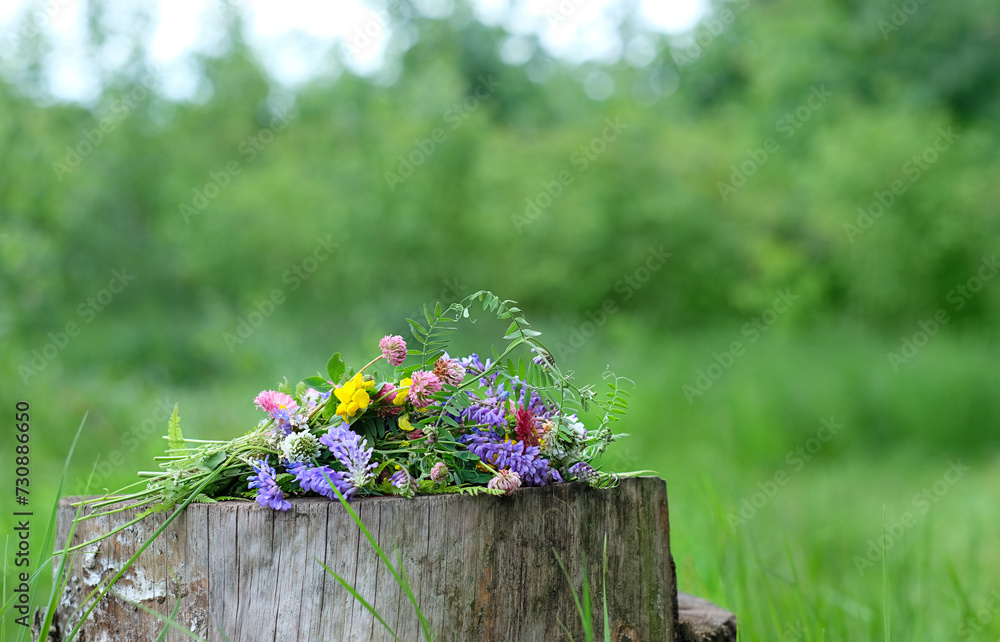 colorful flowers on tree stump in forest, natural background. beautiful wild flowers, symbol of summer season, Midsummer or Litha holidays. botany, study of wild herbs concept. template for design