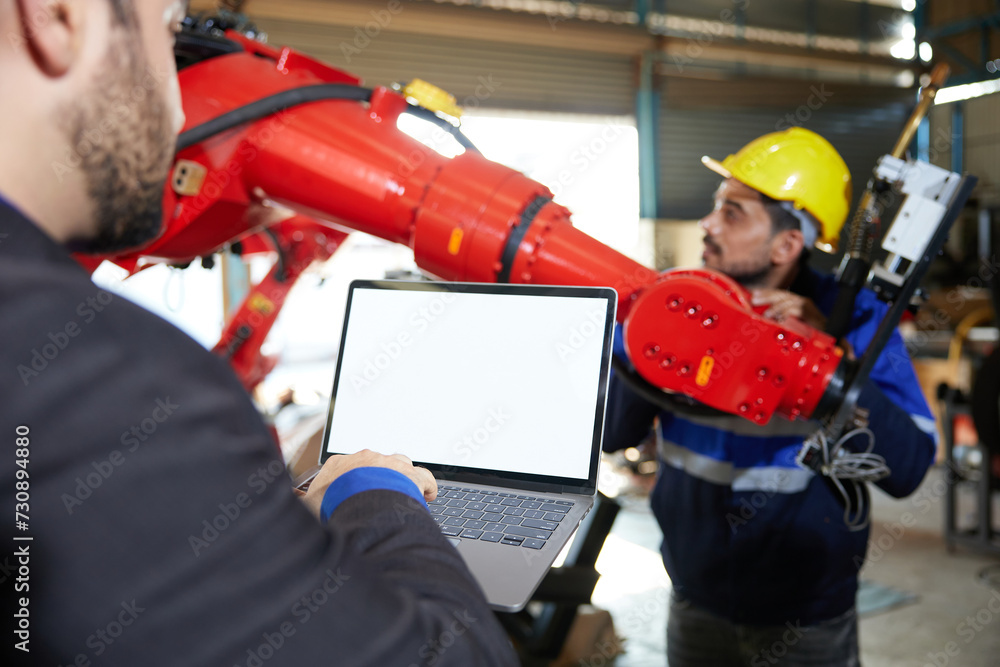 boss using laptop computer for being observed and engineer checking machine in robot factory