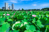 夏の上野恩賜公園 不忍池に咲く蓮の花とビル群【東京都・台東区】 Lotus flowers blooming in the Shinobazu Pond in Ueno Park - Tokyo, Japan