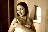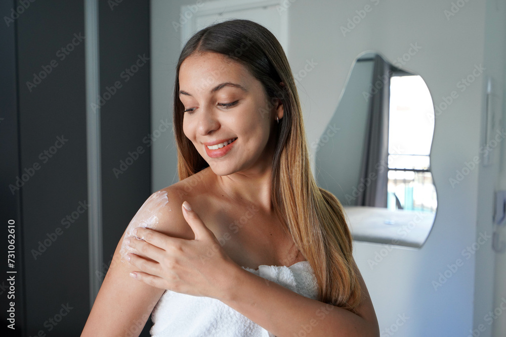 Portrait of gorgeous young woman with long hair applying body cream on her shoulder. Body lotion, moisturizing cream, sun protection cosmetics concept.