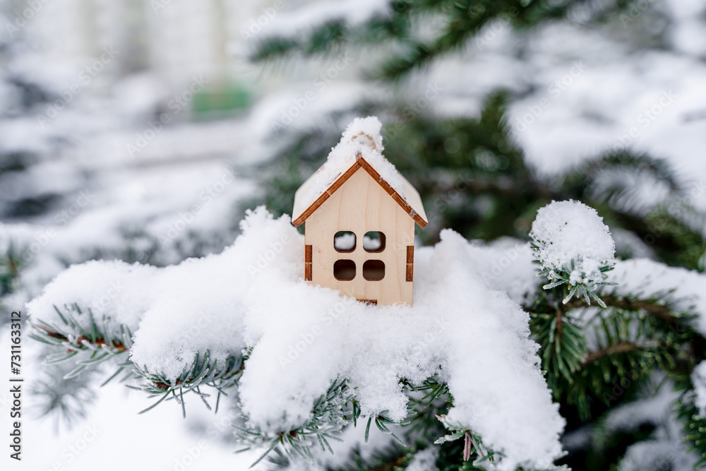 A toy wooden house on a branch of a fir tree in the snow in winter in the park. Concept of winter, Christmas, new year, buying real estate in winter