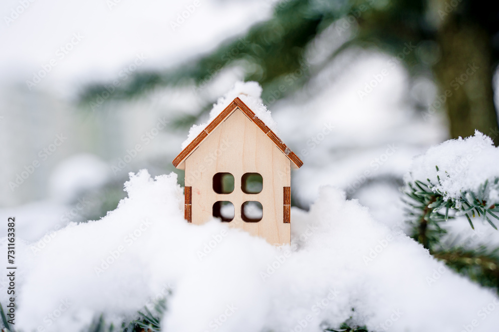 A toy wooden house on a branch of a fir tree in the snow in winter in the park. Concept of winter, Christmas, new year, buying real estate in winter