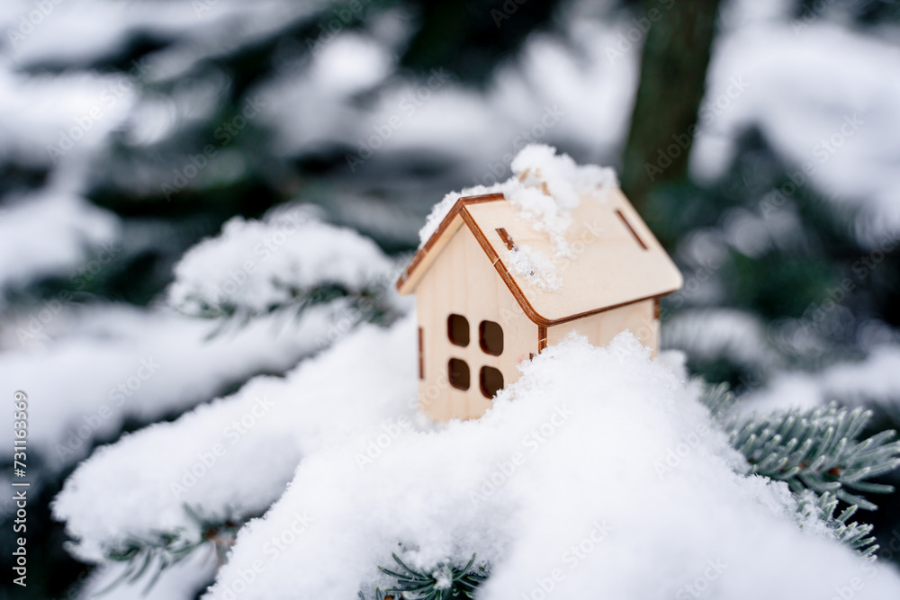 A toy wooden house on a branch of a fir tree in the snow in winter in the park. Concept of winter, Christmas, new year, buying real estate in winter