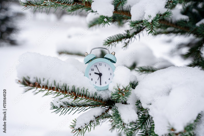 A small alarm clock on a branch of a fir tree in the snow in winter. The concept of New Year, Christmas