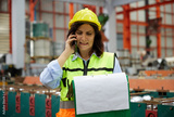 worker or engineer talking on smartphone and looking information on clipboard in the factory