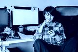 Smiling woman looking at the phone screen while sitting on her home office or office working place. Take a break. Reading the good news. Remote work, social networks, blogging. Telecommuting concept.