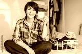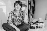 Smiling Woman with basket of selected clothes from her wardrobe for donating to a Charity. Decluttering, Sorting clothes And Cleaning Up. Reuse, second-hand concept. Conscious consumer, sustainability