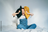 frustrated woman covers ears with pillows, screaming feels furious exhausted exasperated sitting on bed. mad irritated millennial suffers from head ache lack of self-control. Noise and stress concept.