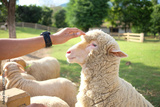 a man reach out his hand to touch a white sheep's head in sheep farm